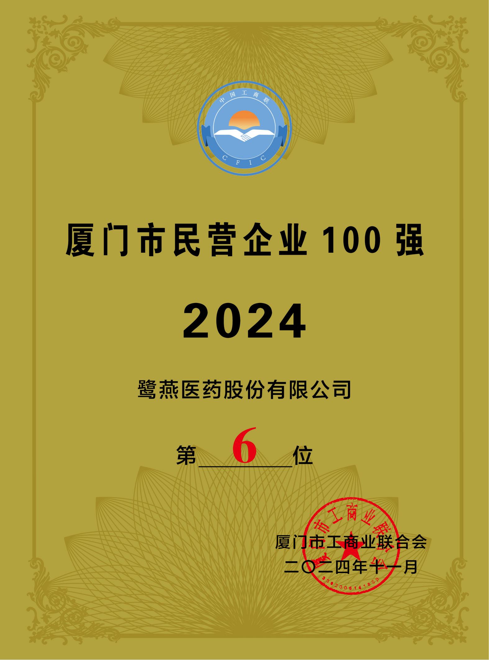 2024年廈門企業(yè)家日大會于11月1日召開,會上發(fā)布2024廈門市民營企業(yè)100強(qiáng)榜單、2024廈門市民營企業(yè)服務(wù)業(yè)20強(qiáng)榜單。鷺燕醫(yī)藥榮登2024廈門市民營企業(yè)100強(qiáng)榜單第6位,2024廈門市民營企業(yè)服務(wù)業(yè)20強(qiáng)榜單第4位!